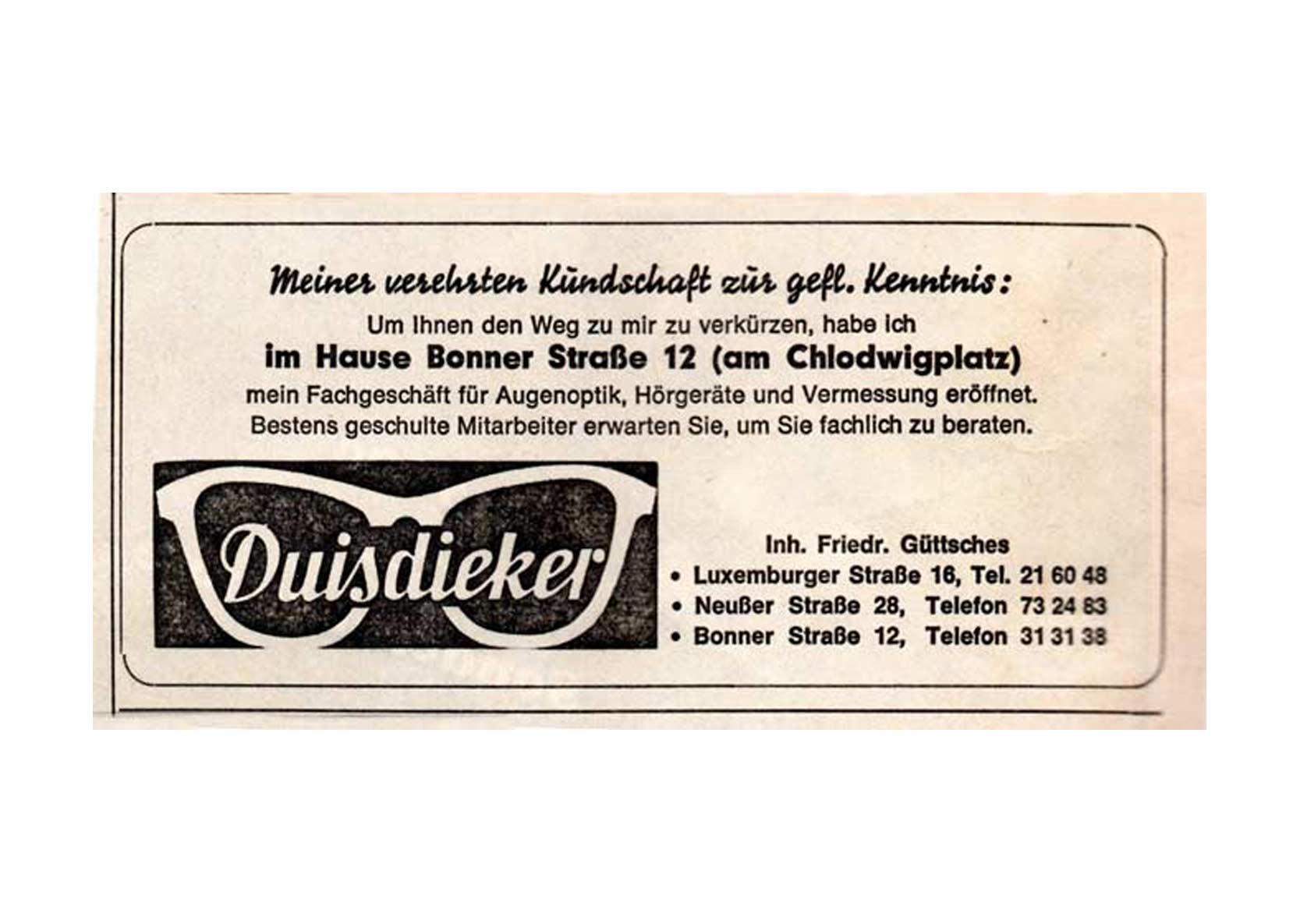 Nach dem Krieg, 1947 trat der Schwiegersohn von Paul Duisdieker, Friederich Güttsches, mit in das Geschäft ein und begann, das Augenoptikerhandwerk zu lernen.