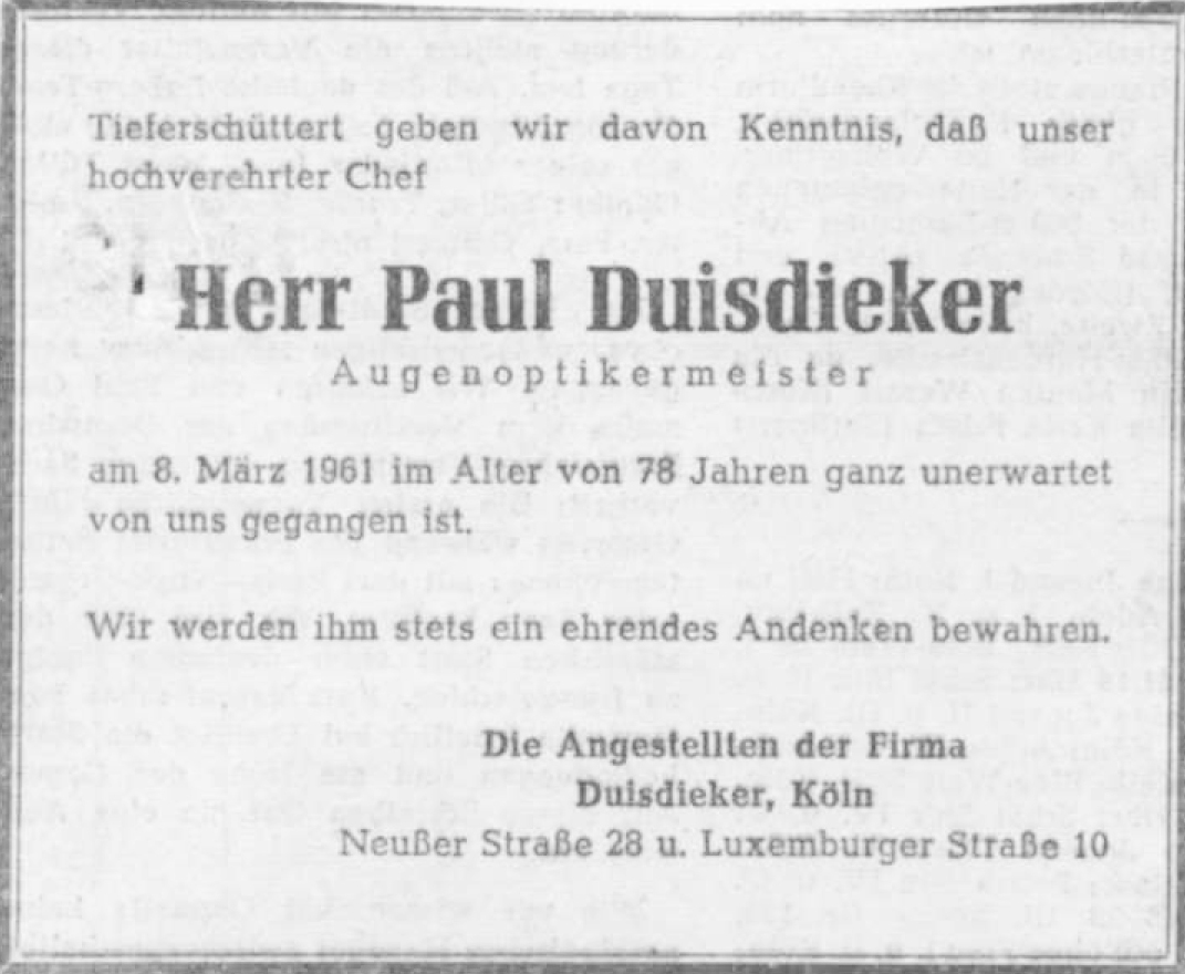 Am 8.März 1961 verstarb Paul Duisdieker im Alter von 78 Jahren. Er erlebte zwar noch den Beginn der Lehre zum Augenoptiker des ältesten Enkels Paul-Friedrich, nicht aber, dass alle drei Enkel das Augenoptikerhandwerk erlernten.