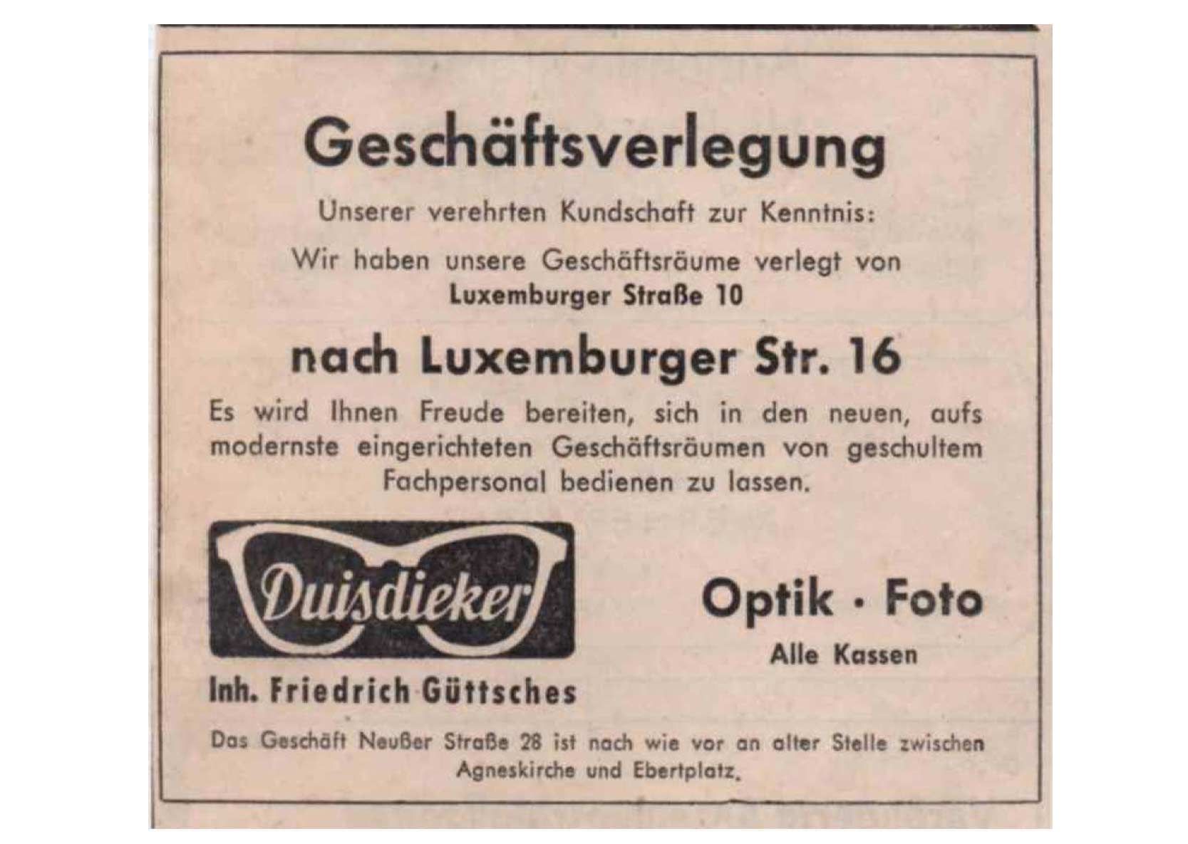 In den Jahren 1961-62 erwarb die Familie das Haus in der Luxemburgerstraße 16 und verlegte das Geschäft dorthin. Der Schwiegersohn von Paul Duisdieker, Friedrich Güttsches wurde Inhaber dieses Ladens.