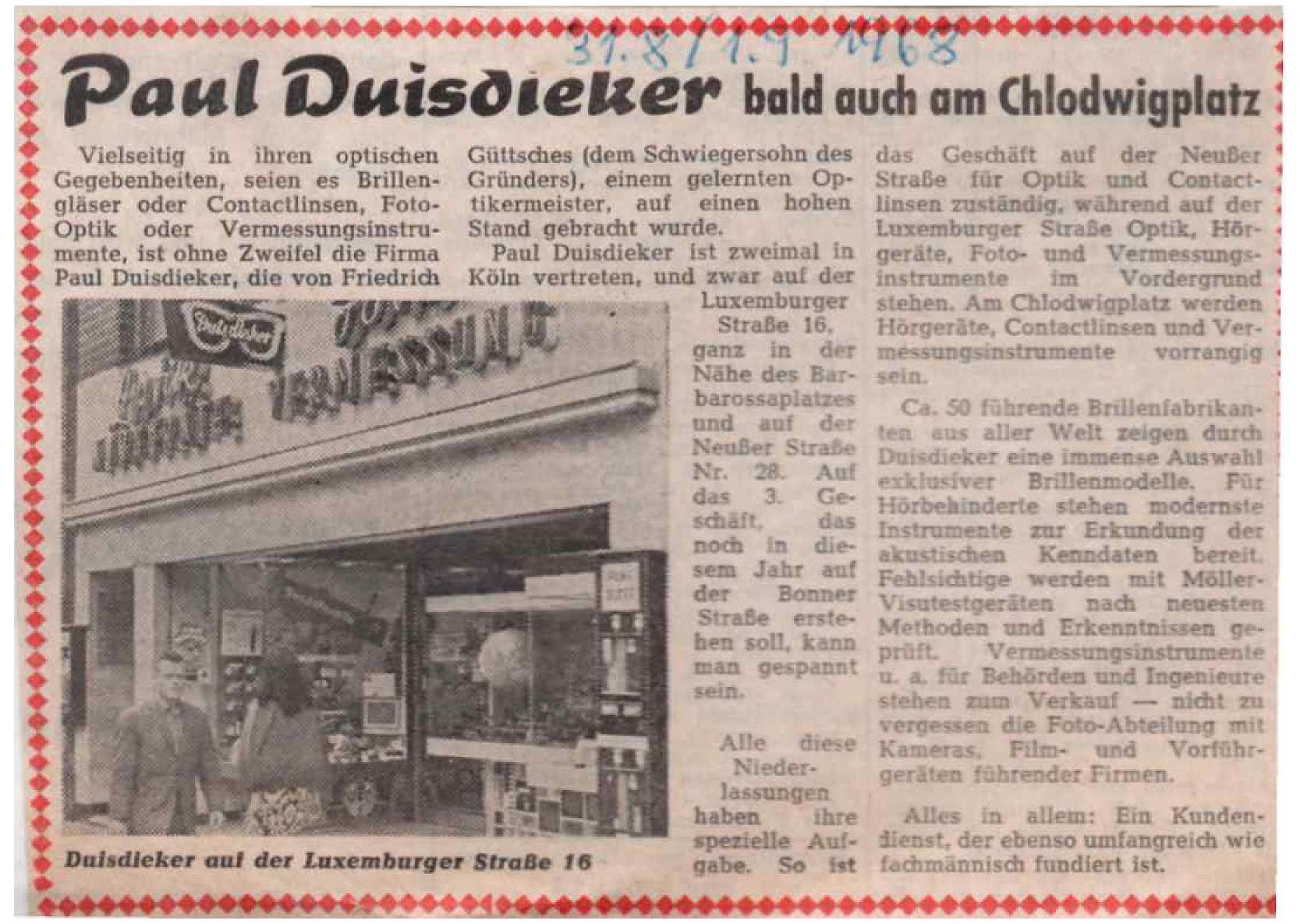 Am 13. März 1929 eröffnete Paul Duisdieker ein Filialgeschäft in der Neußer Strraße 46, Ecke Balthasarstr. Dieses Geschäft wurde am 1. Dezember 1937 in das Haus Neusserstrasse 28 verlagert, wo es bis heute noch ist.